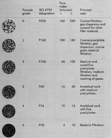 Displayed is basic guide to the grades of porosity of sintered discs available and an idea of the uses of each grade although our glassblowers can offer more accurate advice for your application.